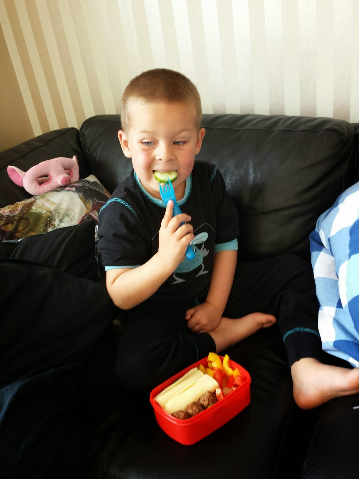 Vincent fick magsjuka i natt. Så den tänkta lunchlådan till förskolan äts nu i soffan.